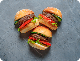 Мини бургер на гриле с котлетой из мраморной телятины соленым оргурцом и салатом лоло россо